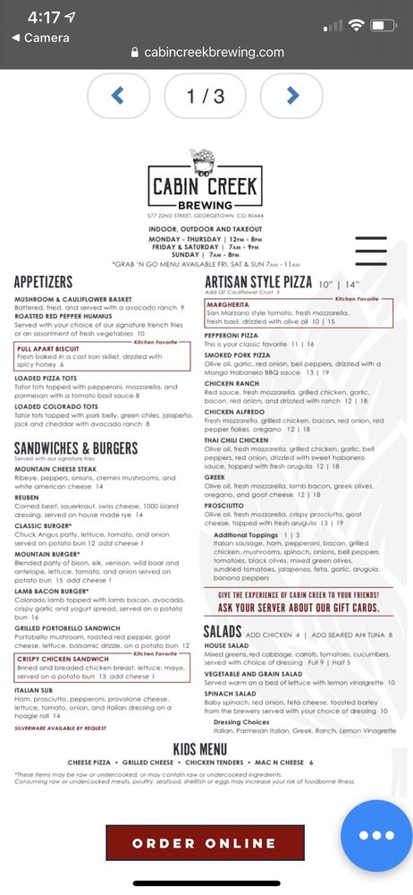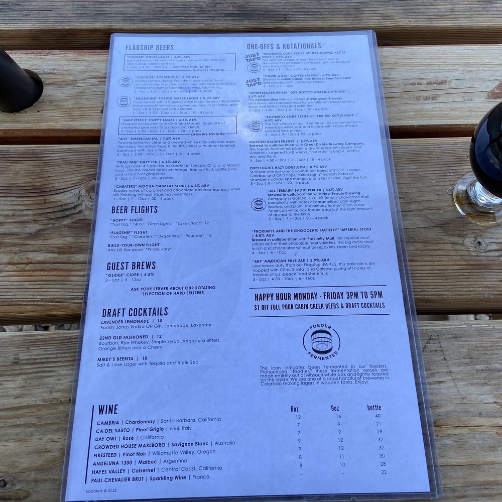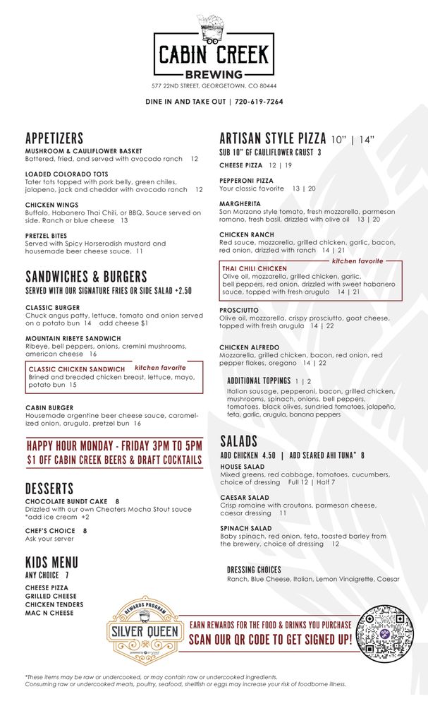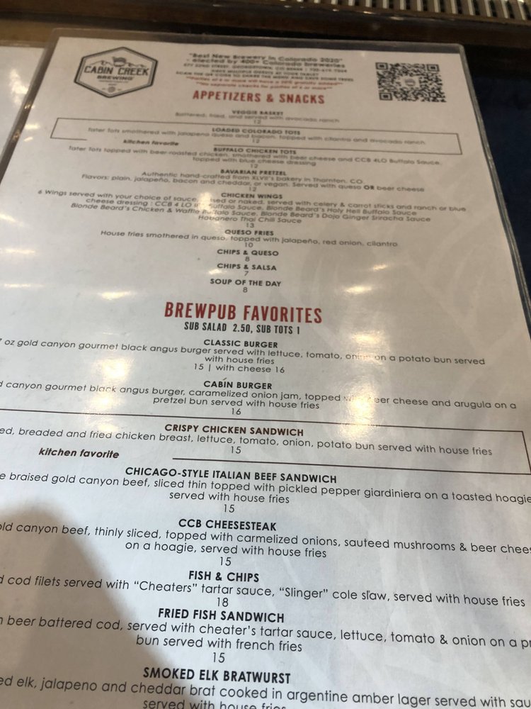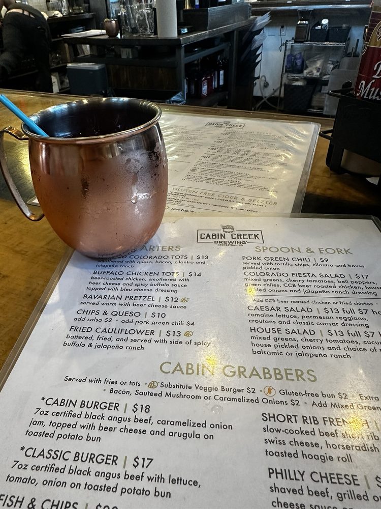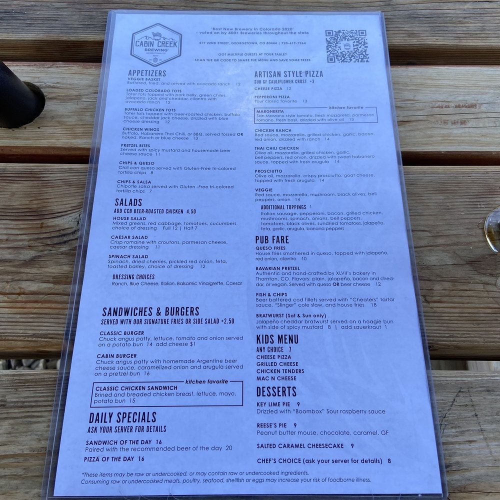 Introducing Cabin Creek Brewing, a cozy Bavarian hunting lodge-themed brewery located in Georgetown, CO. Known for its German dishes and brews, this spot offers a warm atmosphere perfect for gatherings. With a menu featuring fish and chips, Reuben sandwiches, and Margherita pizzas (including cauliflower crust options), there's something for everyone to enjoy. Customers rave about the delicious beignets and Salted Caramel Cheesecake for dessert. The brewery also offers a good selection of beers and stunning views of the mountains and lake. Don't miss out on their loaded Colorado tots and flight options. Overall, Cabin Creek Brewing is a must-visit destination for great food, brews, and ambiance.